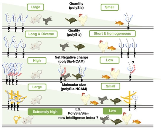 We established the index [relative intensity of polySia-stained band]/[Sia content], which can be used to indicate the concentration ratio of Sia to the polySia structure. Strikingly, the patterns of the index (Figure 10B) were nearly identical to those of the EQ value (Figure 10C). Sia is an important glyco-module that is involved in fertilization, development, inflammation, and neural activity. The ratio of Sia to polySia epitope clearly indicates the accumulation of Sia onto polySia, which is indicative of the effective usage of Sia for these biological/neurological activities. Therefore, this index may provide an index for intelligence. As the intelligence is a vague word and there are several definitions for it. By Roth and Dick, it was defined as the speed and success of how animals solve problems to survive in their natural and social environments, including problems in feeding, spatial orientation and social behavior [46]. The intelligence is achieved by the organized brain functions in the animals, including recognitions, learning and memory, and organization of the information to survive for life. All these higher brain functions are related to the normal and orchestrated organization of the brain areas, such as prefrontal cortex [50], amygdala [51] and hippocampus [52], where polySia expression is usually maintained [15,19], but impaired in the patients of mental disorders. The polySia expression may reflect the higher brain functions. Recently, the polySia and polySia biosynthesizing enzyme ST8SIA2 have been demonstrated to exhibit a relationship with mental disorders, such as schizophrenia, bipolar disorder, depression, and autism. Mental disorders refer to a disease of the human brain activity, and impairment of polySia may lead to higher brain function. Therefore, the polySia/Sia index may provide an index for intelligence. Additionally, the slope of the S /N map revealed a striking difference in mouse polySia-NCAM among the vertebrates tested. Both indices are useful for easy analysis of the quality of polySia-NCAM. Another merit of using the index about polySia is that even using three individuals, the differences of mammals compared to the other vertebrates could be apparently shown, which is also beneficial from the animal welfare perspective. Furthermore, the brain intelligence and recognition ability are also correlated with the cortex and prefrontal cortex [46], and it may be interesting to compare the two indexes, using the different brain regions related with different functions, such as cognition, learning, memory, and emotion.