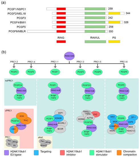 - Gil, J.; O’Loghlen, A. PRC1 complex diversity: Where is it taking us? Trends Cell Biol. 2014, 24, 632–641. [Google Scholar] [CrossRef]