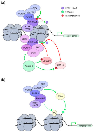 As described above, the E3 activity of Ring1b is enhanced by several other PRC1 components to achieve optimal H2A mono-ubiquitination and hence gene repression [20,53,72,102,103,114]. Recently, factors have been identified that inhibit Ring1b-mediated H2A mono-ubiquitination, providing mechanistic insights into PRC1-mediated transcriptional activation. Biochemical characterization of the PCGF5-containing PRC1.5 complex has led to the identification of additional components including AUTS2 and CK2 [26]. Interestingly, in vitro reporter assays suggest a role for PRC1.5 in transcriptional activation [26]. In contrast to canonical PRC1 complexes, PRC1.5 tend to localize to genomic loci lacking H2AK119ub1, indicating compromised mono-ubiquitination activity. In fact, the stable association of CK2 leads to the neutralization of RING1B enzymatic activity by phosphorylating RING1B at serine 168 (Figure 3a, top) [26]. Another study has found an alternative mechanism responsible for the inhibition of H2AK119ub1 (Figure 3a, bottom) [29]. In mouse quiescent lymphocytes, PRC1.4 colocalizes with Aurora B kinase at active promoters [29]. In contrast to the Ck2-mediated direct phosphorylation of Ring1b, Aurora B kinase inhibits H2A mono-ubiquitination by phosphorylating and deactivating the E2 enzyme Ube2d3; it also promotes H2A de-ubiquitination by phosphorylating and enhancing the enzymatic activity of a deubiquitinase, Usp16.