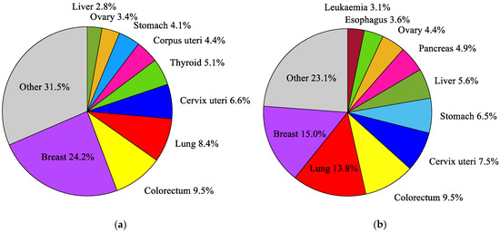 The most common cancers occurring in the world’s female population in 2018: (a) incidence; (b) mortality, according to the global cancer database GLOBOCAN 2018 [38].