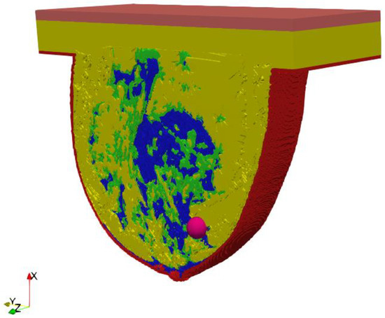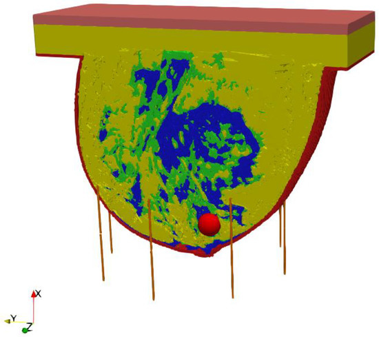 A key part of this in silico study was the development of an anatomically based female breast phantom and its tissue parameters that corresponded to experimentally determined equivalents in terms of real laboratory electro-thermal measurements. The authors developed a lifelike anthropomorphic breast model based on MRI scans validated by a 3D-printed plastic breast phantom [60]. The MRI-derived breast model was characterized by a high spatial resolution of 1 mm and contained 269 × 332 × 202 cubic cells. Such a model can be characterized as a heterogeneously dense (HD) breast phantom with 51–75% glandular tissue content, which corresponds to the breast structure of a 35-year-old female patient with a tumor. In addition to breast glands (marked in blue in Figure 3) and tumor (pink), the 3D geometric female breast phantom also featured other breast tissues, such as fat (green), breast fat (yellow), skin (red), and muscle (orange). Figure 3 depicts a sectional view (xy slice) of the geometric model passing through the tumor (z = 0) seated at location (0, −12, 12) mm.