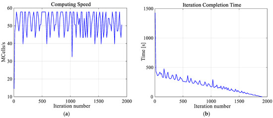 The computing speed (a) and iteration completion time (b) as function of iterations number for the thermal solver. The convergence was obtained after 1911 iterations.