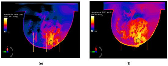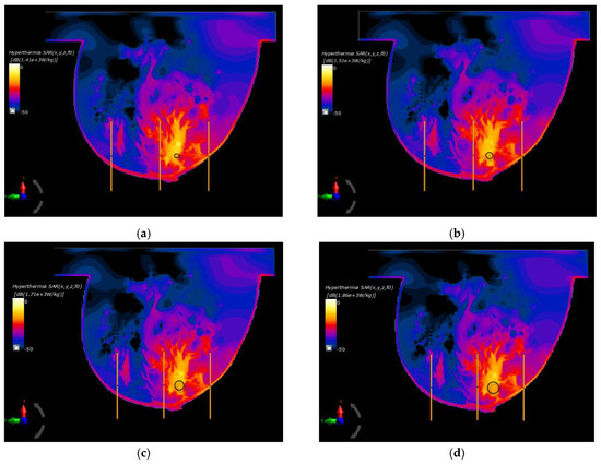 Figure 6f shows an example of SAR distribution for a tumor radius r = 12 mm; however, this was before applying the optimization algorithm (all antennas operate with the same Pi and ϕi values). In this case, the SAR values within the breast tissues around the applicators were similar and had values below 207 W/kg, which illustrates the advantage of warm colors. On the other hand, with optimized SAR distributions, warm colors were concentrated in the immediate vicinity of the breast cancer, which corresponds to an increased power dissipation and heat accumulation in this area.
