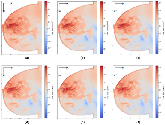 The distributions of power dissipation (Q = ρSAR) in the xy plane for various tumor radii: (a) r = 2 mm; (b) r = 4 mm; (c) r = 6 mm; (d) r = 8 mm; (e) r = 10 mm; (f) r = 12 mm—derived from the eight-dipole antenna array after the optimization procedure (sum Pi = 8 W).