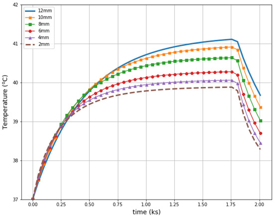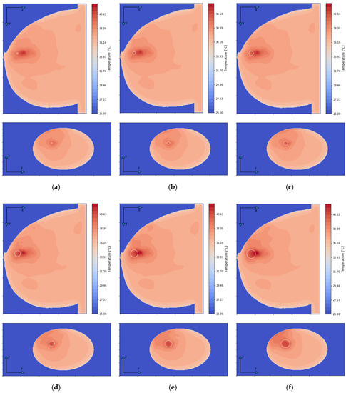 Figure 11 illustrates radius-dependent heat accumulation inside the analyzed breast tumors, according to the modified Pennes’ bioheat equation (Equation (1)). The obtained temperatures in the tumor centers, in the transient state, varied from 39.9 to 41.1 °C, and thus they did not exceed therapeutic levels for hyperthermia treatment. After a 30-min period, the dipoles were turned off, which was illustrated by the collapse of the trend to increase in the breast tumor heating curves.
