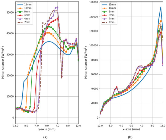 Figure 9 and Figure 10 present the heat source (Q = ρSAR) and temperature dependencies through the tumor along the y- and x-axes, respectively. All curves are referred to the tumor center and compare the distributions for tumors of different sizes. Larger changes in the analyzed parameters are observed along the x-axis than the y-axis of the tumor, which results from the arrangement of various tissues around breast cancer and different perfusion rates characterizing breast tissues. Additionally, the character of Q-profiles strongly depends on the density of the tumor and neighboring tissues. This implies that homogeneous temperature distribution inside the whole tumor volume cannot be achieved in practice by using the described optimization procedure. However, a specific carcinoma’s behavior can be seen in the performed in silico simulation, namely, for tumors of larger size, higher temperature levels are induced in the tumor.