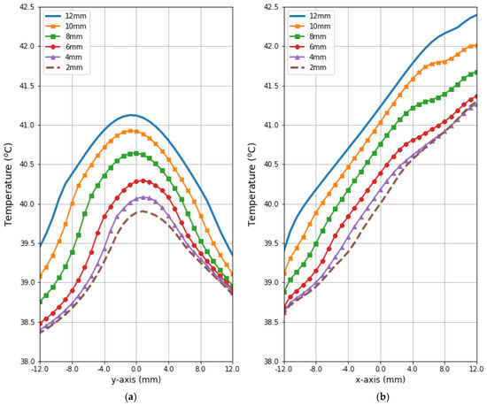 The heating curves running through the center of tumor of different sizes along (a) the y-axis perpendicular to the antenna matrix; (b) the x-axis in the direction of the eight-dipole antenna array after the optimization procedure.