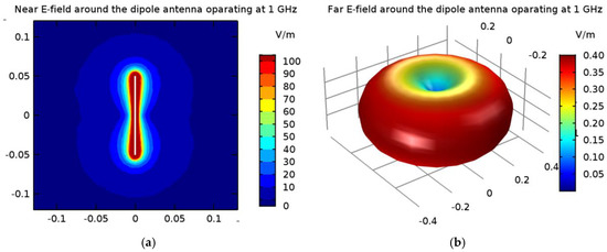 The electric field derived from the 1-GHz half-wave dipole antenna with a shortening ratio set at ks = 0.67: (a) near field distribution; (b) far field radiation.