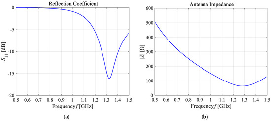 The main frequency-dependent characteristics of the shortened 1-GHz half-wave dipole antenna: (a) the reflection coefficient (S11 = −16.11 dB); (b) the input impedance (Zin = 63.8 Ω).