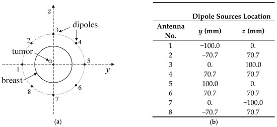 Arrangement of dipole antennas around the breast with a tumor of radius r = 2 mm centered at (0, −12,12) mm: (a): schematic sectional view; (b): dipole sources positions at x = 0 plane (antenna array radius R = 100 mm).