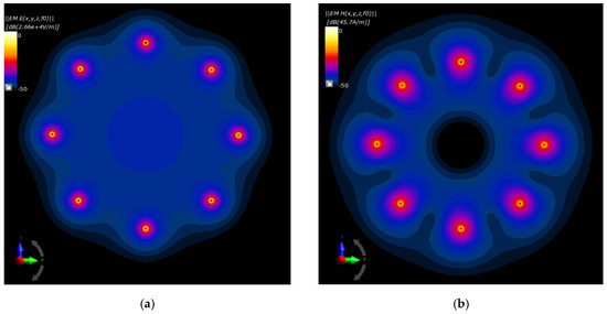 The drawings compared in Figure 16a,b depict, respectively, the electric and magnetic field distributions generated by the analyzed antenna matrix before optimization. To better illustrate the EM field in the ROI, we normalized the E- and H-field distributions to the maximum value and were given on a decibel scale. As expected, the same initial set points for the dipole sources resulted in symmetrical field distribution around the dipoles and homogeneous field distribution inside the antenna array. Only proper parameter optimization of the dipole antenna array will allow for EM energy deposition in the target tissue and thereby heat the breast cancer to healing temperatures.