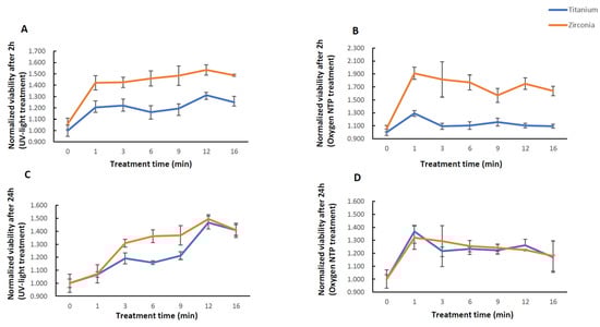 Viability of murine osteoblast-like cells (MC3T3-E1) on controls and time-course surface treated titanium and zirconia disks with UV-light and oxygen non-thermal plasma (NTP) after 2 (A,B) and 24 h (C,D) of incubation.