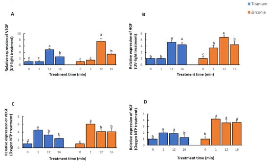 The relative gene vascular endothelial growth factor (VEGF) and hepatocyte growth factor (HGF) expressions of MC3T3-E1 after 24 h of culture following time-course surface treatment of titanium and zirconia with UV-light (A,B) and oxygen NTP (C,D). Each letter on top of each bar indicates the order of relative gene expression, where the letter a indicates the test or control group with the highest relative gene expression. The same letter indicates no statistically significant difference in relative gene expression between the groups. All of the statistical significance values were declared as p < 0.05.