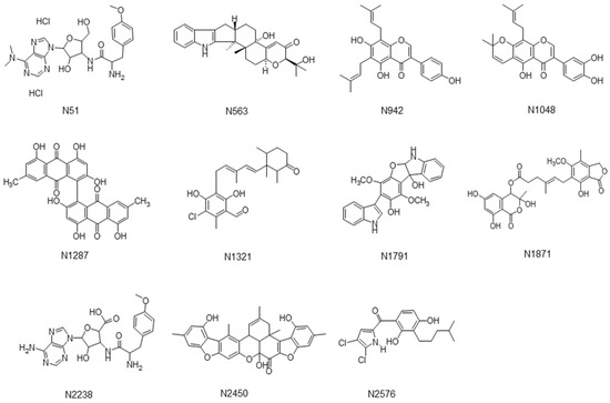 | N2576 | (4,5-dichloro-1H-pyrrol-2-yl)-[2,4-dihydroxy-3-(4-methyl-pentyl)-phenyl]-methanone | 47 ± 4.2 | 32 ± 6.3 |