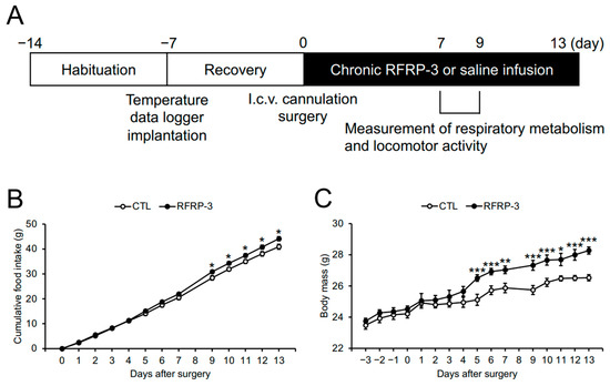 The effects of chronic intracerebroventricular (i.c.v.) infusion of RFamide-related peptide-3 (RFRP-3) on food intake and body mass: (A) experimental schedule, (B) cumulative food intake, and (C) body mass. The food intake and body mass could not be measured 8 d after the infusion of RFRP-3 because the mice were housed in a metabolic cage. Each value represents the mean ± standard error of the mean. n = 7–8; * p < 0.05, ** p < 0.01, *** p < 0.005.