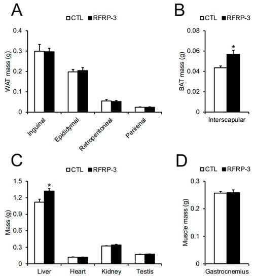 To examine what contributed to the body mass gain in chronic RFRP-3 infused mice, we weighed the adipose tissues, organs, and muscle. Although the masses of the inguinal, epididymal, retroperitoneal, and perirenal white adipose tissues (WAT) were unchanged (Figure 2A), the mass of the interscapular brown adipose tissue (BAT) increased (Figure 2B). In addition, the liver mass increased, while the masses of the heart, kidney, testis, and gastrocnemius muscle tissues did not change (Figure 2C,D).