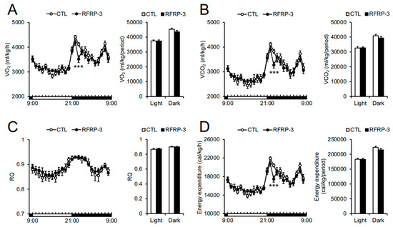 Seven to eight days after the infusion of RFRP-3, indirect calorimetry was performed using an O2/CO2 metabolism-measuring system for small animals (MK-5000RQ; Muromachi Kikai, Tokyo, Japan). The system monitored VO2 (mL/min) and VCO2 (mL/min) at 3-min intervals and calculated the RQ ratio (VCO2/VO2). The locomotor activity was simultaneously measured using the SUPERMEX infrared ray passive sensor system (Muromachi Kikai). The measurements were collected hourly or every 15 min over a 24 h period (light period: 09:00 a.m.–21:00 p.m., dark period: 21:00 p.m.–09:00 a.m.) after 24 h of habituation for 7 d after the infusion of RFRP-3. Energy expenditure was calculated using Equation (1) [59]: