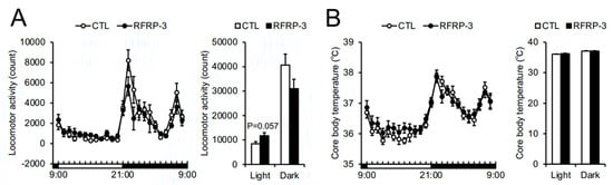 In summary, the present study is the first report showing the chronic central effect of RFRP-3 on the regulation of energy metabolism, including orexigenic action, in mice. Furthermore, the administration of RFRP-3 in the brain regulated systemic energy balance through temporal decreases in energy expenditure and core body temperature during the early dark phase. Further studies are needed in order to understand the molecular and/or anatomical mechanisms of regulation by RFRP-3 in energy metabolism.