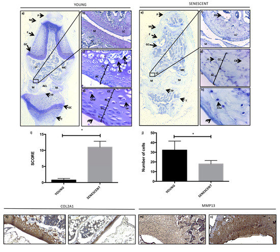 Histopathological comparisons of young and senescent rat knees: (a,e) Young and senescent rat knees, respectively. P: patella; Mu: muscle; F: femur; GC: growth cartilage; LC: lateral condyle; M: medial condyle; M: meniscus; ACL: anterior cruciate ligament; TP: tibial plateau; and T: Tibial. (b–d,f–h) Articular cartilage of young and senescent rat knees; respectively. Cho: chondrocytes; SB: spongy bone; CB: compact bone; AC: articular cartilage; CC: calcified cartilage; RL: radial layer; TrL: transitional layer; TL: tangential layer; and Pe: perichondrium. (a,e) The images were obtained with a Stereo Zoom Microscope Leica S6D 0.63×. (b,f) 15×; (c,g) 40×; (d,h) 100× and (k–n) 15× images were obtained with a Leica DM 2000 LED microscope and a digital camera (Leica MC 170 HD). (i) Modified Mankin Score. * p < 0.05. (j) Quantification of the number of chondrocytes in both groups, p < 0.05. (k–m) Immunohistochemistry of collagen II (Col2a1) and metalloproteinase 13 (Mmp13) in the young and senescent groups, respectively.