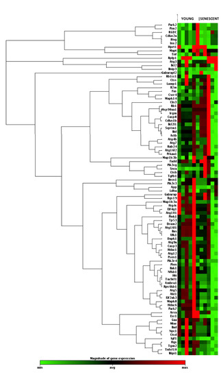 Heatmap of gene expressions and unsupervised hierarchical cluster analysis for genes of the autophagy pathway comparing young rats (3 weeks, N = 6) and senescent rats (25 months, N = 5). All data were normalized to the best housekeeping genes. Green = downregulated; red = upregulated. Magnitude of log2 (fold change): from −1.84 to 1.84.