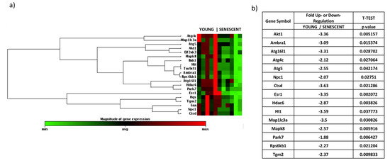 Differentially expressed genes of the autophagy pathway comparing the young knee and senescent knee groups. (a) Heatmap of gene expressions and unsupervised hierarchical cluster analysis for genes of the autophagy pathway comparing young rats (3 weeks, N = 6) and senescent rats (25 months, N = 5). The values are expressed in log2. All data were normalized to the best housekeeping genes. Green = downregulated; red = upregulated. Magnitude of log2 (fold change): from −1.84 to 1.84. (b) Fold changes of differentially expressed genes. Gene expression was evaluated using the ∆∆CT method, considering a fold change of >1.5 and Student’s t-test with a p-value < 0.05 as criteria. Negative values indicate downregulation, and positive values indicate upregulation. Akt1: V-akt murine thymoma viral oncogene homolog 1; Ambra1: Autophagy/beclin 1 regulator 1; Atg16l1: ATG16 autophagy related 16-like 1 (S. cerevisiae); Atg4c: ATG4 autophagy-related 4 homolog C (S. cerevisiae); Atg5: autophagy-related 5 homolog (S. cerevisiae); Npc1: Cdig2 protein; Ctsd: cathepsin D; Esr1: estrogen receptor 1; Hdac6: histone deacetylase 6; Htt: huntingtin; Map1lc3a: microtubule-associated protein 1 light chain 3 alpha; Mapk8: mitogen-activated protein kinase 8; Park7: Parkinson’s disease (autosomal recessive, early onset) 7; Rps6kb1: ribosomal protein S6 kinase, polypeptide 1; Tgm2: Transglutaminase 2, C polypeptide. p-values were calculated on the bases of Student’s t-test of replicate values of 2^ (-delta CT) for each gene for the senescent and young groups.