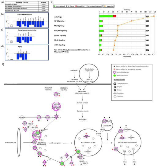 To identify potential associations between deregulated genes and cellular process, diseases, or functions, we performed a bioinformatics approach to explore the biological relevance of observed changes. We submitted a gene list showing significant differences between the analyzed groups to Advaita Bio’s iPathwayGuide (https://www.advaitabio.com/ipathwayguide) and to Ingenuity Pathway Analysis (IPA®, Qiagen, Redwood City, CA, USA). The Advaita Bio’s iPathwayGuide analysis linked our deregulation with processes such as cellular homeostasis and aging (Figure 4a,d). The IPA found a relationship with autophagy, insulin-like growth factor 1 (IGF-1) and PI3K (phosphoinositide 3-kinase)/AKT (serine/threonine kinase) signaling among others (Figure 4e). Furthermore, the IPA identified several genes that are involved in the autophagy pathway, the senescence pathway, and skeletal and muscular disorders, thus confirming its association (Figure 4f).