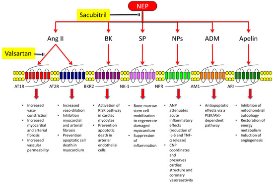 Effects of angiotensin receptor and neprilysin (NEP) inhibition. Angiotensin receptors type 1 (AT1Rs) inhibition by valsartan reduces vasoconstriction, myocardial fibrosis, and vascular permeability induced by angiotensin II (Ang II). Consistently, it favours vasodilation and cell protection against apoptotic death through angiotensin receptors type 2 (AT2Rs). NEP inhibition by sacubitril increases levels of natriuretic peptides (NPs), bradykinin (BK), substance P (SP), adrenomedullin (ADM), and apelin, thereby amplifying protective pathways mediated by these molecules. BKR2: bradykinin receptor 2; NK-1: neurokinin-1 receptor; NPR: natriuretic peptide receptor; AM-1; adrenomedullin receptor-1; APJ: apelin receptor; RISK: reperfusion injury salvage kinase; IL-6: interleukin 6; TNF-α: tumor necrosis factor-α.