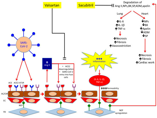 It is always more recognized that the pathogenicity for COVID-19 is enhanced by an inflammatory overreaction leading to abnormal production of cytokines to fight the viral infection [3]. This phenomenon is called cytokine release syndrome (CRS). Hence, many studies targeted the utilization of some immune-modulatory agents as COVID-19 therapies to minimize the disease severity [4]. Simultaneously, identifying angiotensin-converting enzyme 2 (ACE2) as a viral entry receptor emphasized the important role of the classical renin–angiotensin–aldosterone system (RAAS) in COVID-19 pathophysiology. Some researchers suggested that the use of ACE inhibitors and/or angiotensin receptor blockers (ARBs), may blunt the severe inflammatory reactions and improve endothelial dysfunction caused by stimulating angiotensin II type 1 receptors (AT1Rs) [5]. Interestingly, one RAAS component, namely neprilysin (NEP), is implicated in the degradation of molecules exerting a protective effect on lung and cardiovascular system. Moreover, NEP has emerged as an interesting pharmaceutical target for treatment of cardiovascular disease, in particular of heart failure (HF) [6,7], that is a frequent lethal consequence of SARS-CoV-2 infection [2].