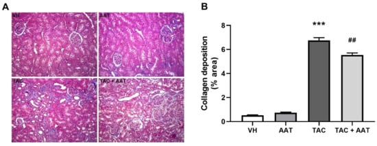 Effect of alpha-1 antitrypsin on collagen deposition in tacrolimus-induced renal injury. (A) Trichrome staining (200× magnification). (B) Quantitative analysis of collagen deposition area. Data are presented as means ± standard errors; *** p < 0.001 vs. VH; ## p < 0.01 vs. TAC. Abbreviations: VH, vehicle group; AAT, alpha-1 antitrypsin treatment group; TAC, tacrolimus treatment group; TAC + AAT, tacrolimus and alpha-1 antitrypsin cotreatment group.