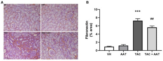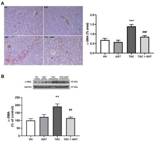 Further, Western blotting analysis of the kidneys revealed a significant increase in the α-SMA expression in the TAC group over the VH group (TAC vs. VH; p < 0.01); however, the α-SMA expression was decreased in the group treated with TAC and AAT together as compared to the group treated with TAC (TAC vs. TAC + AAT; p < 0.01) (Figure 3B).