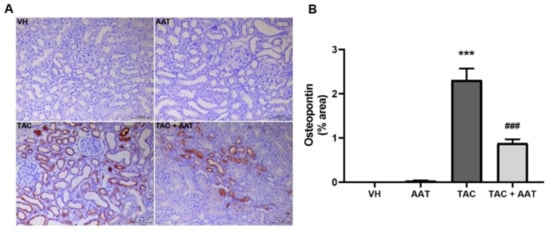 Effect of alpha-1 antitrypsin on osteopontin staining in tacrolimus-induced renal injury. (A) Immunohistochemical staining for osteopontin (200× magnification). (B) Quantitative analysis of osteopontin staining area. Data are presented as means ± standard errors; *** p < 0.001 vs. VH; ### p < 0.001 vs. TAC. Abbreviations: VH, vehicle group; AAT, alpha-1 antitrypsin treatment group; TAC, tacrolimus treatment group; TAC + AAT, tacrolimus and alpha-1 antitrypsin cotreatment group.