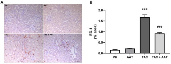Effect of alpha-1 antitrypsin on ED-1 staining in tacrolimus-induced renal injury. (A) Immunohistochemical staining for ED-1 (200× magnification). (B) Quantitative analysis of ED-1 staining area. Data are presented as means ± standard errors; *** p < 0.001 vs. VH; ### p < 0.001 vs. TAC. Abbreviations: VH, vehicle group; AAT, alpha-1 antitrypsin treatment group; TAC, tacrolimus treatment group; TAC + AAT, tacrolimus and alpha-1 antitrypsin cotreatment group.