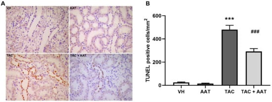 Effect of alpha-1 antitrypsin on apoptosis detected by terminal deoxynucleotidyl transferase-mediated dUTP nick-end labeling (TUNEL) assay in tacrolimus-induced renal injury. (A) Immunohistochemical staining for TUNEL staining (400× magnification). (B) Quantitative analysis of TUNEL-positive cells. Data are presented as means ± standard errors; *** p < 0.001 vs. VH; ### p < 0.001 vs. TAC. Abbreviations: VH, vehicle group; AAT, alpha-1 antitrypsin treatment group; TAC, tacrolimus treatment group; TAC + AAT, tacrolimus and alpha-1 antitrypsin cotreatment group.