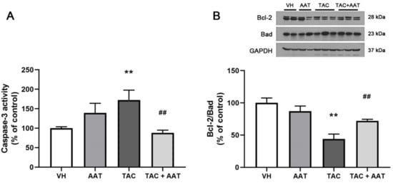 (A) Effect of alpha-1 antitrypsin on caspase-3 activity, and (B) Bcl-2 and Bad protein expression in tacrolimus-induced renal injury. Data are presented as means ± standard errors; ** p < 0.01 vs. VH; ## p < 0.01 vs. TAC. Abbreviations: VH, vehicle group; AAT, alpha-1 antitrypsin treatment group; TAC, tacrolimus treatment group; TAC + AAT, tacrolimus and alpha-1 antitrypsin cotreatment group.