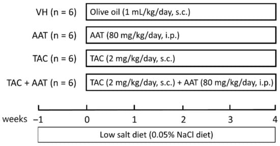 Eight-week-old male Sprague–Dawley rats (Hyochang Science, Daegu, South Korea), initial weight 220–230 g, were sheltered in a facility free of pathogens with a 12-h light/dark schedule, and they had free access to food and water at the animal care facility of Kyungpook National University. The animal experiment protocol was approved by the Animal Care and Use Committee at the Kyungpook National University (KNU-2019-0007; approval date: 9/1/2019), and all experiments on animal performed in this study were based on ethical guidelines for animal studies. The schematic experimental design is shown in Figure 8. The rats were fed with a low-salt diet (0.05% sodium, Teklad Premier, Madison, WI, USA). Tacrolimus (CKD Bio Corporation, Seoul, South Korea) was dissolved in olive oil (Sigma-Aldrich, St. Louis, MO, USA) to the final concentration of 1 mg/mL. After acclimatization and a low-salt diet for 1 week, the rats were randomized into 4 groups and were treated daily for 4 weeks as follows: subcutaneous injection with olive oil (1 mg/mL) (VH group; n = 6); intraperitoneal injection with AAT (80 mg/kg) (AAT group; Aralast; Baxter Healthcare, Vienna, Austria; n = 6); subcutaneous injection with TAC (2 mg/kg) (TAC group; n = 6); and simultaneous treatment with TAC and AAT (TAC + AAT group; n = 6).