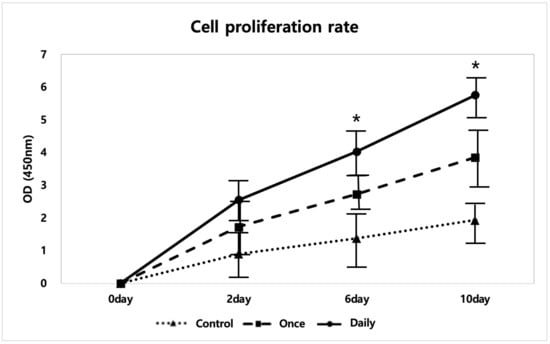 As seen in Figure 1, both the Once and Daily groups had increased proliferation rates after SP injection compared to the Control group. As the number of days in culture progressed, all three groups, the Control, Once, and Daily groups, showed a steady increase in proliferation. However, the Once and Daily groups displayed a steeper increase. The Daily group had a significantly higher cell proliferation rate after 10 days of culture (p < 0.05; Figure 1).