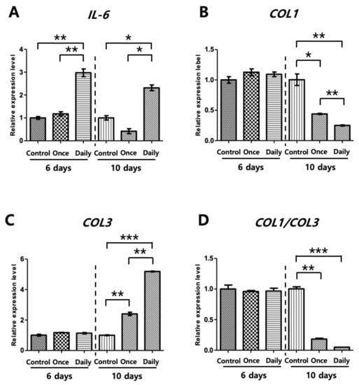 Total RNA was extracted on 6 days and 10 days from cultured human tenocytes treated with phosphate-buffered saline (PBS) or SP. Quantitative real-time polymerase chain reaction (qRT-PCR) analysis was performed to examine the changes in expression levels among the inflammatory response and collagen deposition genes such as IL-6, Col1, and Col3. There was a significant increase in IL-6 in the Daily group. In addition, the injection of SP induced an increase in Col3, a gene linked to immature and disorganized collagen type with structural weakness in the tendons. Simultaneously, there was a decrease in Col1 at the end of 10 days. Therefore, the ratio of Col1/Col3 decreased significantly in the Daily group. The Col1 gene is abundantly expressed in bones and normal collagen [21]. During the regenerative phase, Col1 is abundant; however, an increase in Col3 instead results in microtears, and the buildup of microtears progresses into tendinopathy (Figure 2) [1,22].