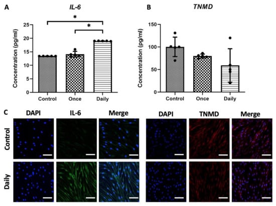 Next, the IL-6 and tenomodulin (TNMD) protein concentrations in growth media at 10 days of cell culture were measured using enzyme-linked immunosorbent assay (ELISA). The IL-6 protein level showed a significant increase at 10 days in the Daily group. However, there was no statistically significant difference in the level of the tenocyte marker, TNMD, among the Control, Once, and Daily groups (Figure 3A,B).