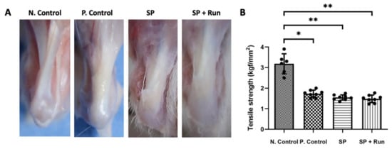 Biomechanical testing revealed that the N. Control group had a significantly higher (1.88 times) tensile strength than the other groups (p < 0.05 or 0.01). However, there were no significant differences between the P. Control, SP, and SP + Run groups (Figure 4B).