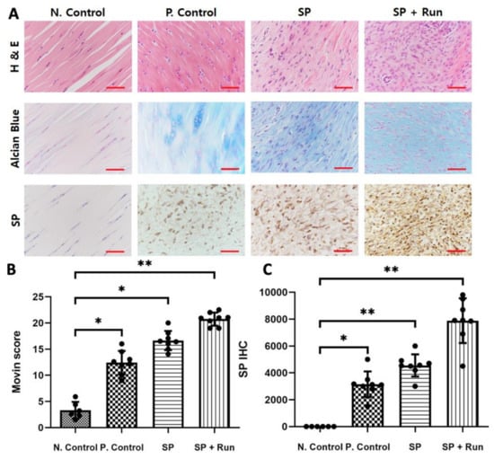 After 2 weeks of SP injection, the gross appearance of tendon specimens was observed to determine the effects of SP injection and SP injection with treadmill running. The harvested Negative (N.) Control tendon showed an apparent normal tendon structure without any swelling or inflammation. Compared with the N. Control, P. Control, SP, and SP + Run groups showed yellowish, thickened tendons, which points to swollen tendons due to inflammation. Among the experimental groups, the SP + Run group showed the most severe appearance with a dull yellowish thickened tendon (Figure 4A).