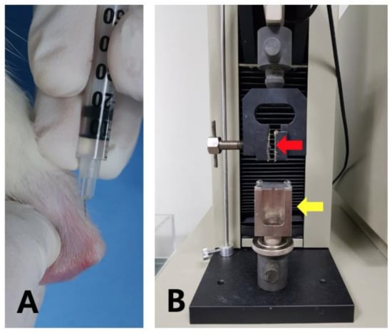 Injection in the Achilles tendon, treadmill running, biomechanical test machine. Using a 27-G needle, phosphate-buffered saline or substance P (SP) was injected to the insertion of the Achilles tendon. To make the needle direction parallel to the long axis of the Achilles tendon, the needle was bent before injection. After the Achilles tendon was fully stretched through knee extension and ankle dorsiflexion, the needle was introduced distally from the musculotendinous junction (A). A biomechanical test machine was used to measure the tensile strength of the muscle-tendon-bone complex. Red and yellow arrows indicate sample holders for the musculotendinous junction and bone tendon complex, respectively (B).