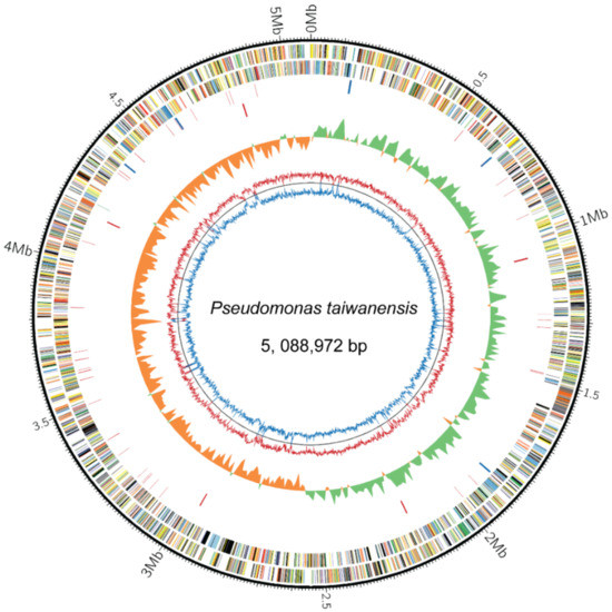 The genome of P. taiwanensis genome was sequenced and generated via a de novo assembly from 454 (Roche) long reads and paired-end Illumina short reads. Using Solexa paired-end sequencing, the total output produces 3389 million paired-end total read length with an average length of 79 bases after adaptor trimming, giving approximately 666-fold coverage of the genome. In addition, the 454 sequencing produces total output of 248 million read length with an average length of 382 bases after adaptor trimming, giving approximately 48.7-fold coverage of the genome. The contigs from Solexa and 454 were organized by high-resolution restriction map (optical map) from a single strain DNA of P. taiwanensis (Supplementary Figure S1). The P. taiwanensis genome is composed of one circular chromosome of 5,088,972 base pairs (NCBI accession no. CP011858) with 62.6% GC content and annotated to encode 4477 proteins (Figure 1). P. taiwanensis carries 16 rRNA, 68 tRNA, and 1 ncRNA genes. In GC skew analysis [15], the chromosome of P. taiwanensis revealed two typical GC skew transitions, which correspond to the replication origin (ori) and terminus (ter) (Circle 5, Figure 1). The chromosomal origin of replication (oriC) contains a specific DnaA-binding site which is located near the dnaA gene [16] (25). In most prokaryotic chromosomes, the leading strand is G-rich and the lagging strand is C-rich [17]. In P. taiwanensis, the GC skew shows a symmetrical structure of oriC located opposite the terminus position (Circle 5, Figure 1) and the cumulative GC skew displays a typical mountain shape (see Figure S2). The origin and terminus axis are related to bacterial growth efficiency and replication mechanism [18]. P. taiwanensis has a general structure of symmetry between the leading and lagging strand, which is similar to P. entomophila L48, whereas P. putida KT2440 and P. aeruginosa PAO1 have asymmetrical structures [4,19,20].