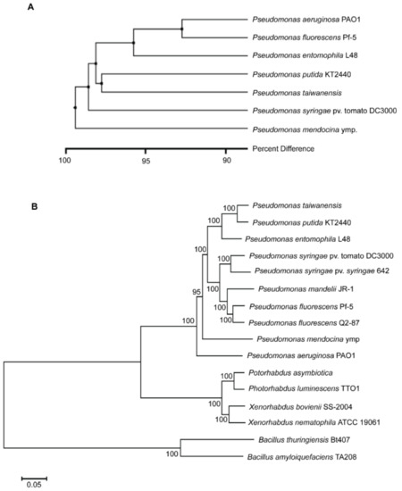 Phylogenetic analysis of P. taiwanensis was performed by optical restriction mapping based on the unweighted-pair group method with arithmetic averages (UPGMA) [25]. The whole genome optical BamHI-restriction map of P. taiwanensis was compared to those of other Pseudomonas species that were derived from public genomic sequences with in silico BamHI digestion (Figure 2A). The whole genome restriction map of P. taiwanensis displays over 95% difference compared to those of other Pseudomonas species. This indicates that the genomes of Pseudomonas genus are highly diverse. Furthermore, 16 bacteria belonging to four different genera, including plant pathogens, human pathogens, and biocontrol agents, were subjected to phylogenetic analysis based on seven housekeeping genes using multilocus sequence typing (MLST) analysis (Figure 2B). The phylogenetic tree clearly shows that bacteria can be separated into 4 different groups. The Gram-positive bacteria Bacillus can be distinguished from other Gram-negative bacteria. The whole genome optical BamHI-restriction map (Figure 2A) and multilocus sequence typing (MLST) analyses (Figure 2B), and the phylogenetic trees show a close relationship between P. taiwanensis and other Pseudomonas species. Phylogenomics and systematics of the genus Pseudomonas have been extensively studied [26,27]. The phylogenetic trees shown in Figure 2 are consistent with published phylogenetic trees. In the trees, P. taiwanensis is most closely related to P. putida KT2400 and its second closest relation is the insect pathogen P. entomophila L48 in the phylogeny. P. aeruginosa, which is an opportunistic pathogen associated with humans and other vertebrates [2], is located farther away from P. taiwanensis on the tree. However, P. taiwanensis does not have a cytotoxic effect on mouse macrophages and may not be pathogenic to mammals [8].