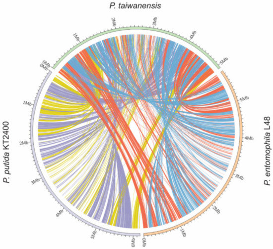 To detect global sequence similarity, we used MUMmer to align genomes and observe homology between P. taiwanensis (Y-axis) and P. putida KT2400 (X-axis) or P. entomophila L48 (X-axis). MUMmer software revealed an X-shape alignment pattern in the dot plot in which a conserved region formed a straight line and a scattered distribution indicates less homology between two species. P. taiwanensis displayed less homology of large genomic regions when compared to P. putida KT2400 and P. entomophila L48 (see Figure S4). Next, we used the Artemis Comparison Tool (ACT) for pairwise genomic sequence comparison [28] and visualized the comparison of the three genomes using Circos [29]. Figure 3 shows the genome arrangement of P. taiwanensis, P. putida KT2400 and P. entomophila L48. Orange and yellow lines connect the positions of sequence similarities among P. taiwanensis, P. putida KT2400, and P. entomophila L48. In contrast, light blue and purple lines connect the inverted positions (Figure 3). A large rearrangement profile was detected when the P. taiwanensis genome was compared with those of P. putida KT2400 and P. entomophila L48. Even though P. taiwanensis and P. putida KT2400 are more closely related to each other than to P. entomophila according to phylogenetic analysis (Figure 2), we found that P. taiwanensis has a lower synteny with other Pseudomonas species (Figure 3).