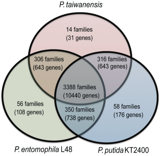 We used the orthoMCL [30] to define homologous proteins and clustered orthologs among P. taiwanensis, P. putida KT2400, and P. entomophila L48 genomes. A total of 4488 families were identified, of which 3388 families containing 10,440 protein-coding genes were common among all three genomes (Figure 4). Thirty-one protein-coding genes belonging to 14 families were found only in P. taiwanensis, 176 protein-coding genes belonging to 58 families were found only in P. putida KT2400, and 108 coding-genes belonging to 56 families were found only in P. entomophila L48. P. taiwanensis specific proteins are shown in Supplementary Table S2.