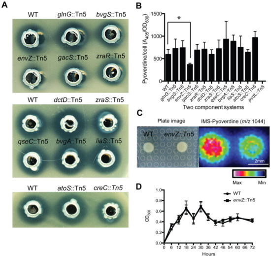 Among the 913 Tn5-inserted mutants, we also identified genes that are potentially involved in regulating the production of pyoverdine (Table 1). Two component systems (TCSs) are widely distributed in prokaryotes and perform signal transduction in response to environmental stimulations by regulating downstream gene expression [42]. Moreover, TCSs exhibit effects on virulence gene expression in prokaryotes, such as PhoP-PhoQ regulating virulence in Salmonella, and BvgA-BvgS being a dominant regulator of virulence in Bordetella pertussis [43]. In P. aeruginosa and P. syringae, GacA-GacS plays an important role in pathogenesis in plants and animals [44]. GacA-GacS is also a broad regulator of secondary metabolite synthesis in P. fluorescens [45]. In a mutant library of P. taiwanensis, we compared anti-Xoo activities in mutants of 12 TCS (bvgS, bvgA, envZ, atoS, gacS, zraR, glnG, dctD, gseC, liaS, creC, zraS) under iron-limited conditions (Figure 6A). TCS mutants envZ::Tn5, gacS::Tn5, zraR::Tn5 and zraS::Tn5, creC::Tn5 showed lower toxicity against Xoo compared to other TCS mutants (Figure 6A). However, only envZ::Tn5 mutant showed significantly lower pyoverdine production (Figure 6B). Furthermore, by matrix-assisted laser desorption/ionization-imaging mass spectrometry (MALDI-IMS) detection, envZ::Tn5 mutant secreted a lower level of pyoverdine (m/z 1044) compared to wild type (Figure 6C). EnvZ::Tn5 mutant did not affect growth compared to wild type under iron-limited conditions (Figure 6D). The copy numbers of Tn5 insertion in each TCS mutant were determined by Southern blot analysis. The results showed that except for lias::Tn5 mutant, all the TCS mutants contained a single-copy Tn5 insertion (see Supplementary Figures S5 and S6).