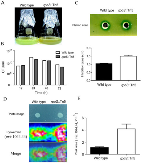 Negative regulation of pyoverdine by RpoS. (A) Wild type and rpoS mutant were incubated for 72 h at 28 °C with 200 rpm in iron-limited medium, and (B) numbers of CFU of wild type and rpoS mutant were measured during 72 h incubation. (C) In antagonistic assay, total broth of wild type and mutant after 72 h incubation were placed into the hole of Xoo-containg 1/2 agar plate, and then the inhibition zone was measured (cm). (D) MALDI-IMS of pyoverdine from wild type and rpoS mutant on the surface of an iron-limited agar plate after 72 h incubation. (E) Quantification of pyoverdine from culture supernatant of wild type and rpoS mutant after 72 h incubation using LTQ-Orbitrap mass spectrometer. Intensity gradients for pyoverdine as color histograms (maximum, white; minimum, black). Scale bar, 2 mm.