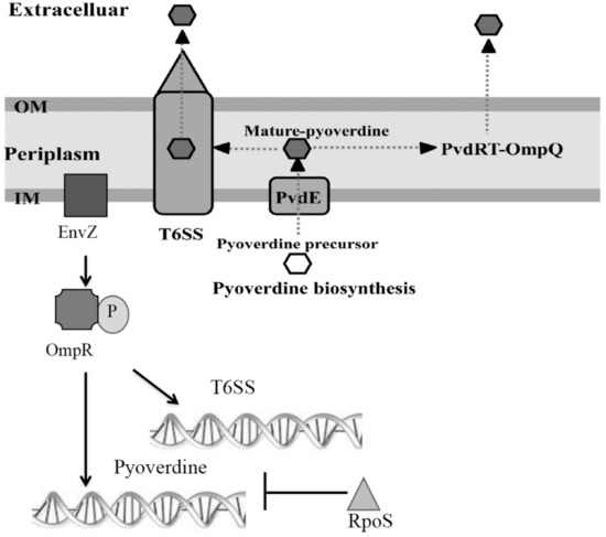 Proposed scheme for synthesis, secretion and regulation of pyoverdine.Pyoverdine precursors are synthesized in the cytoplasm and secreted into the periplasm by the inner membrane transporter PvdE, and processed into mature pyoverdine in the periplasmic space. T6SS is involved in the secretion of pyoverdine via an unknown mechanism. EnvZ/OmpR positively regulates pyoverdine production, whereas the sigma factor RpoS negatively affects pyoverdine production.