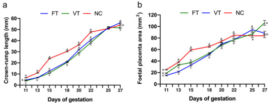 The CRL foetus from 11 to 22 days of gestation registered significant differences. Both FT and VT groups showed a lower foetal length and foetal placental area, disappearing afterwards (Figure 1a,b, respectively).