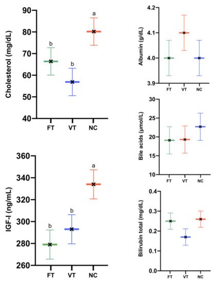 Attending to the serum biochemical marker results, lower levels of cholesterol were exhibited by the VT animals (56.9 ± 6.3 vs. 66.4 ± 6.6 and 80.2 ± 6.34 mg/dL, for the FT vs. VT and NC groups, respectively, p < 0.05. Figure 3). Lower levels of IGF-I were shown by the VT and FT animals compared to NC (293 ± 13.3 and 279 ± 12.9 vs. 334 ± 13.6 mg/dL, for the VT and FT vs. NC groups, respectively, p < 0.05. Figure 3). No significant differences were observed for the rest of the parameters. Levels ranged between the normal values.